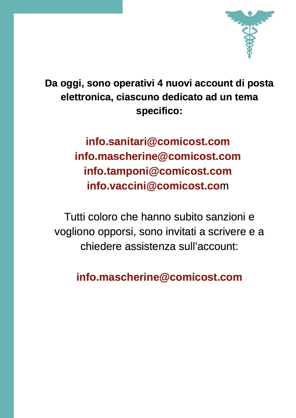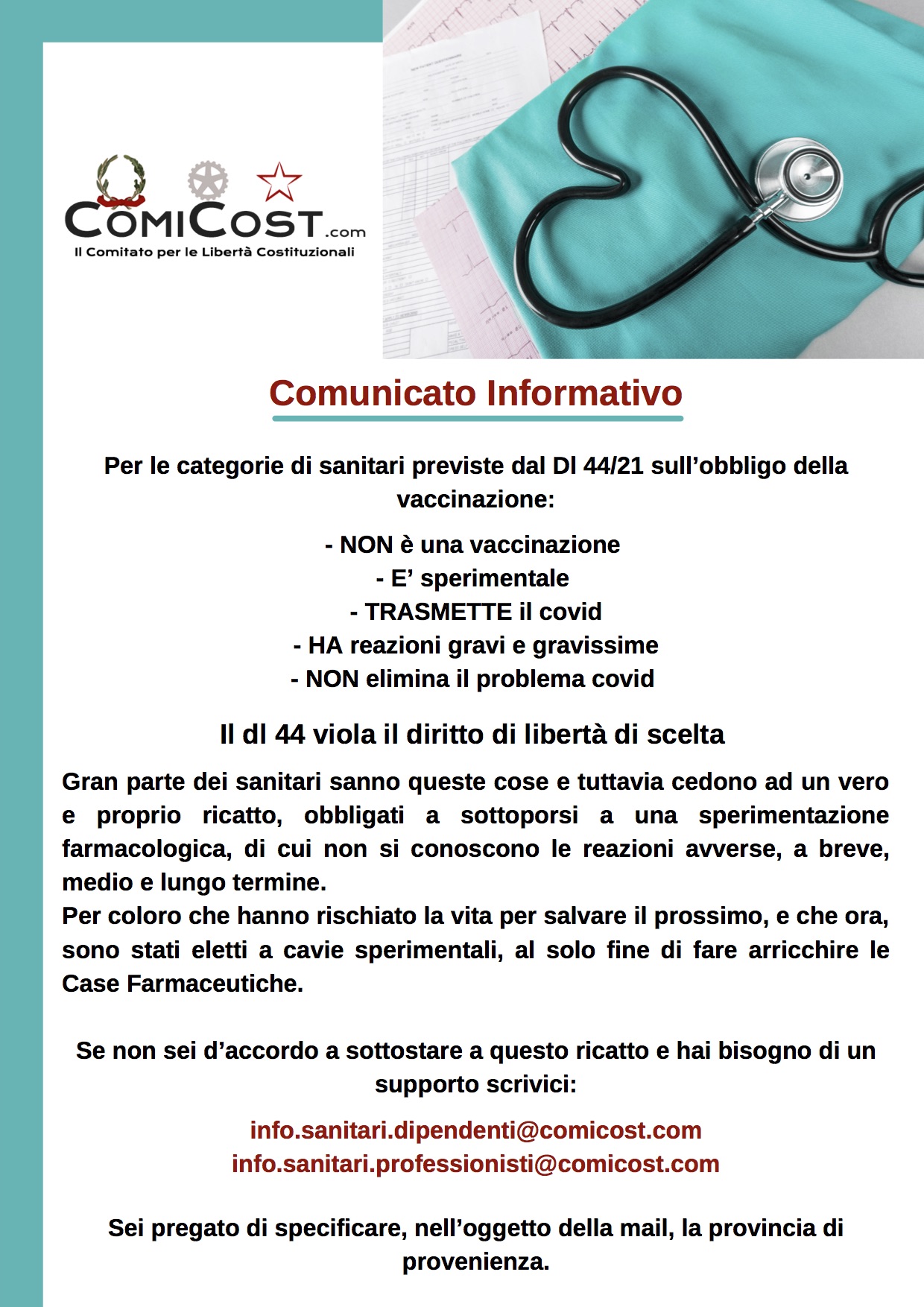 Comicost è a disposizione affinché tutti coloro che intendono ricevere la cosiddetta vaccinazione siano opportunamente tutelati e affinché tutti coloro che al momento non intendono sottoporsi alla cosiddetta vaccinazione possano far valere le proprie ragioni in ogni sede (civile, penale, amministrativa ed internazionale).