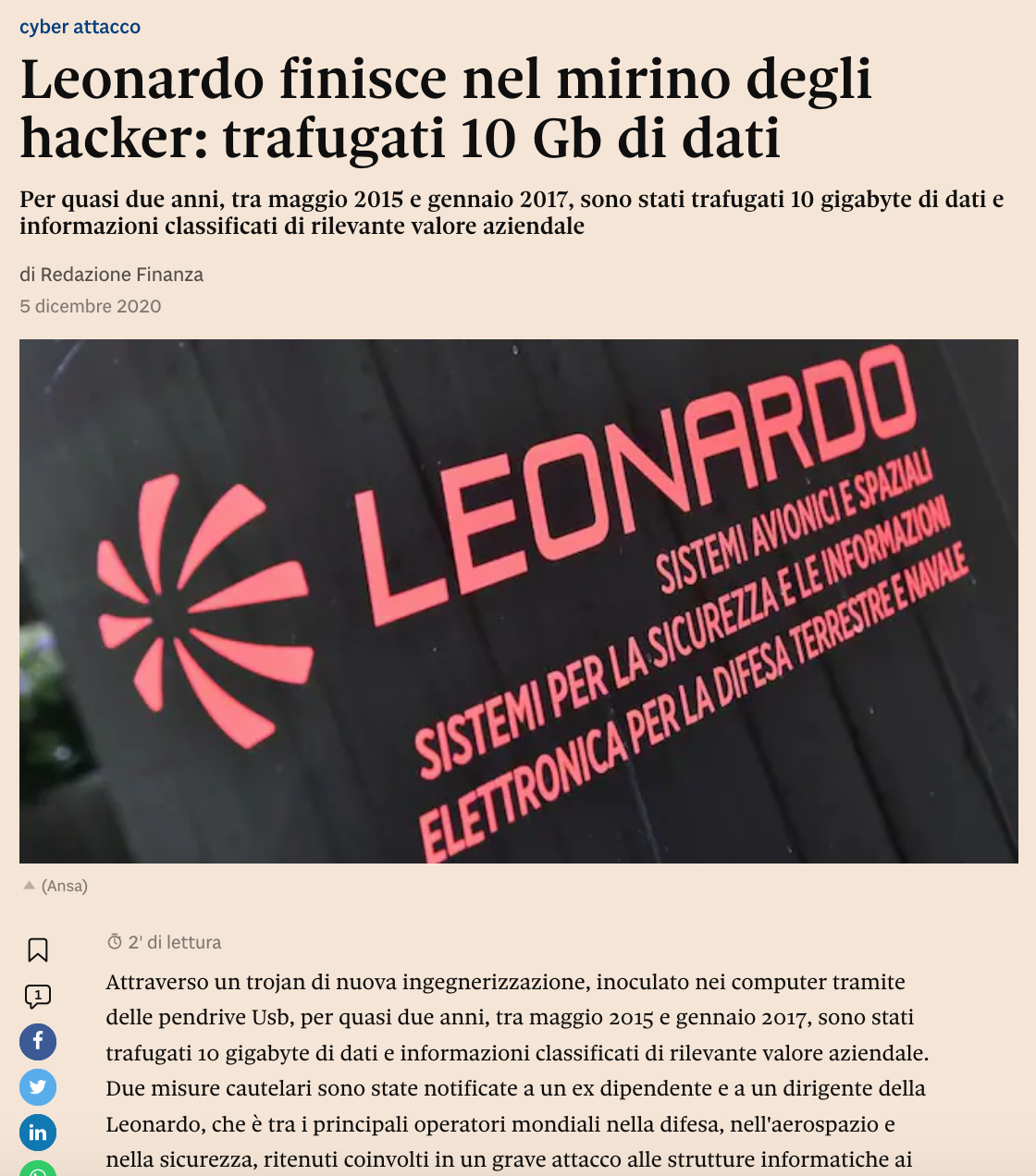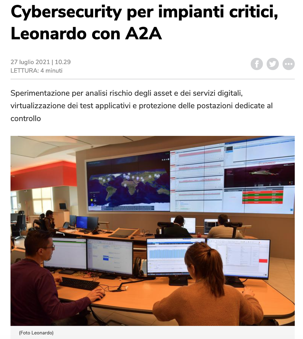 Intanto ieri è stata ufficializzata la nuova collaborazione tra Leonardo (ex Finmeccanica, oggi player internazionale dedicato allo sviluppo di capacità operative multidominio in ambito Aerospazio, Difesa e Sicurezza attraverso il presidio delle tecnologie strategiche) e A2A (società di produzione, trading e vendita di servizi energetici, guidata da Renato Mazzoncini) per “testare sul campo nuovi prototipi di soluzioni sviluppati per rispondere alle esigenze specifiche di cyber-security delle infrastrutture energetiche”.