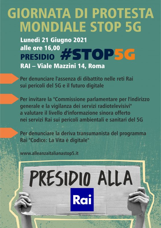 21 Giugno, Alleanza Italiana Stop 5G presidia la RAI: “dibattito sui rischi oscurato da pubblicità e trasmissione transumanista”. Alleanza Italiana Stop 5G torna a manifestare. … Leggi tutto 21 Giugno, Alleanza Italiana Stop 5G presidia la RAI