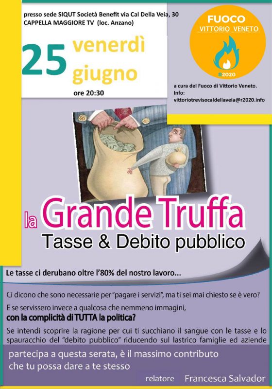 In anteprima per voi la locandina della serata di macroeconomia che abbiamo organizzato come fuoco di Vittorio Veneto per venerdì 25 giugno. Se qualche referente … Leggi tutto LA GRANDE TRUFFA, tasse e debito pubblico