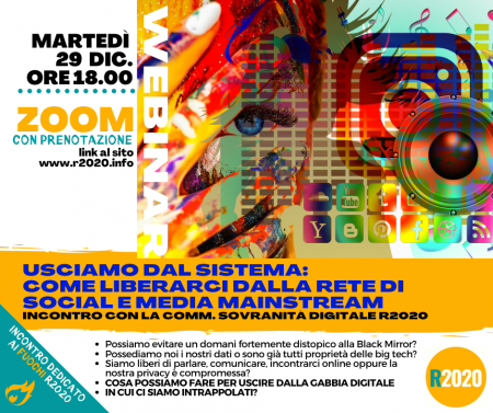 Usciamo dal sistema: come liberarci dalla rete di social e media mainstream. Incontro con la Comm. sovranità digitale, riservato ai fuochi R2020. Possiamo evitare un domani … Leggi tutto Usciamo dal sistema: come liberarci dalla rete di social e media mainstream.